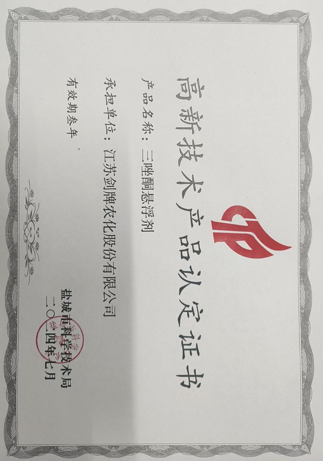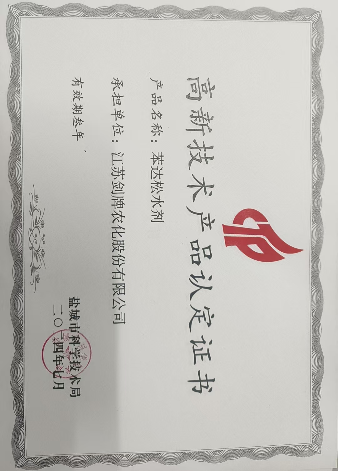 “十五”期间,承担江苏省“三药”重点科技攻关项目——50吨/年斑锈灵(A体三唑 醇),通过省科技厅组织的中试鉴定及项目验收,产品列入科技部火炬计划,国家级重点新产品。自行开发的200吨/年(100%)磺草灵项目,通过省科技厅 组织的中试鉴定, 并获得科技部颁发的国家级新产品证书。